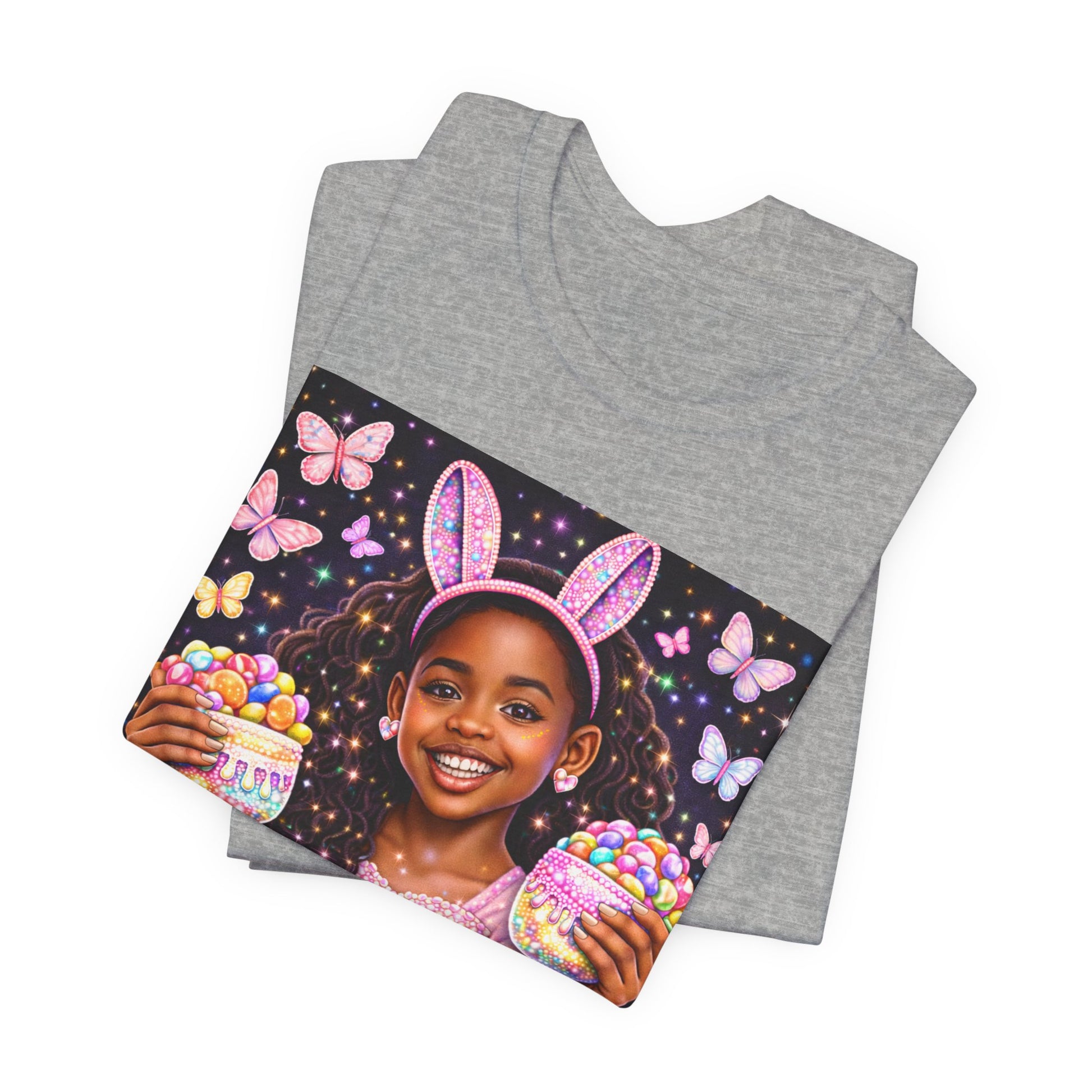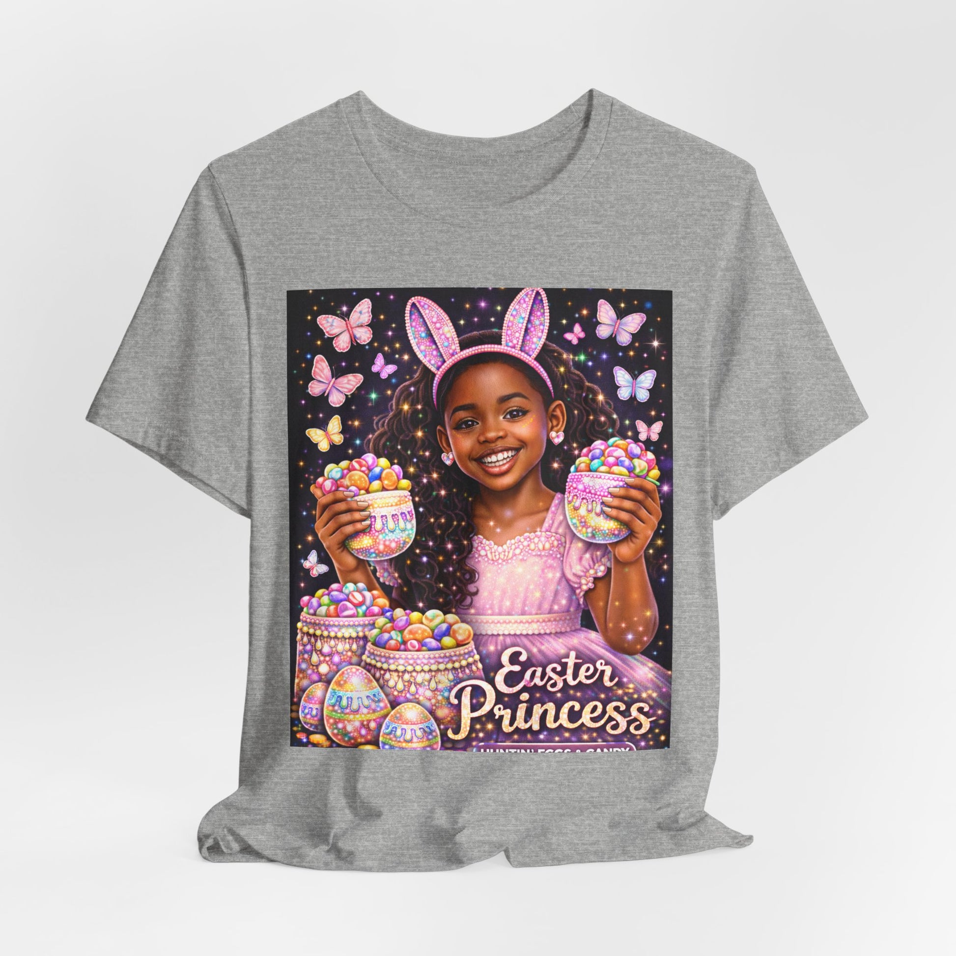 Soft, breathable, and bright — this lightweight tee brings springtime joy to little wardrobes. The central artwork features a smiling girl in bunny ears, surrounded by pastel eggs and fluttering butterflies, with “Easter Princess” scripted below. The crew neck and retail fit make it easy to layer under jackets or wear solo on warm mornings. Thoughtful details like side seams, a ribbed knit collar, shoulder tape, and a tear-away label keep the shirt comfortable and well-shaped through many wears and washes. Made from Airlume combed and ring-spun cotton for a smooth, soft hand and printed with high-detail DTF/DTG techniques so the colors and tiny sparkles hold up over time. Ethically produced and REACH certified, this tee blends playful seasonal style with everyday comfort.