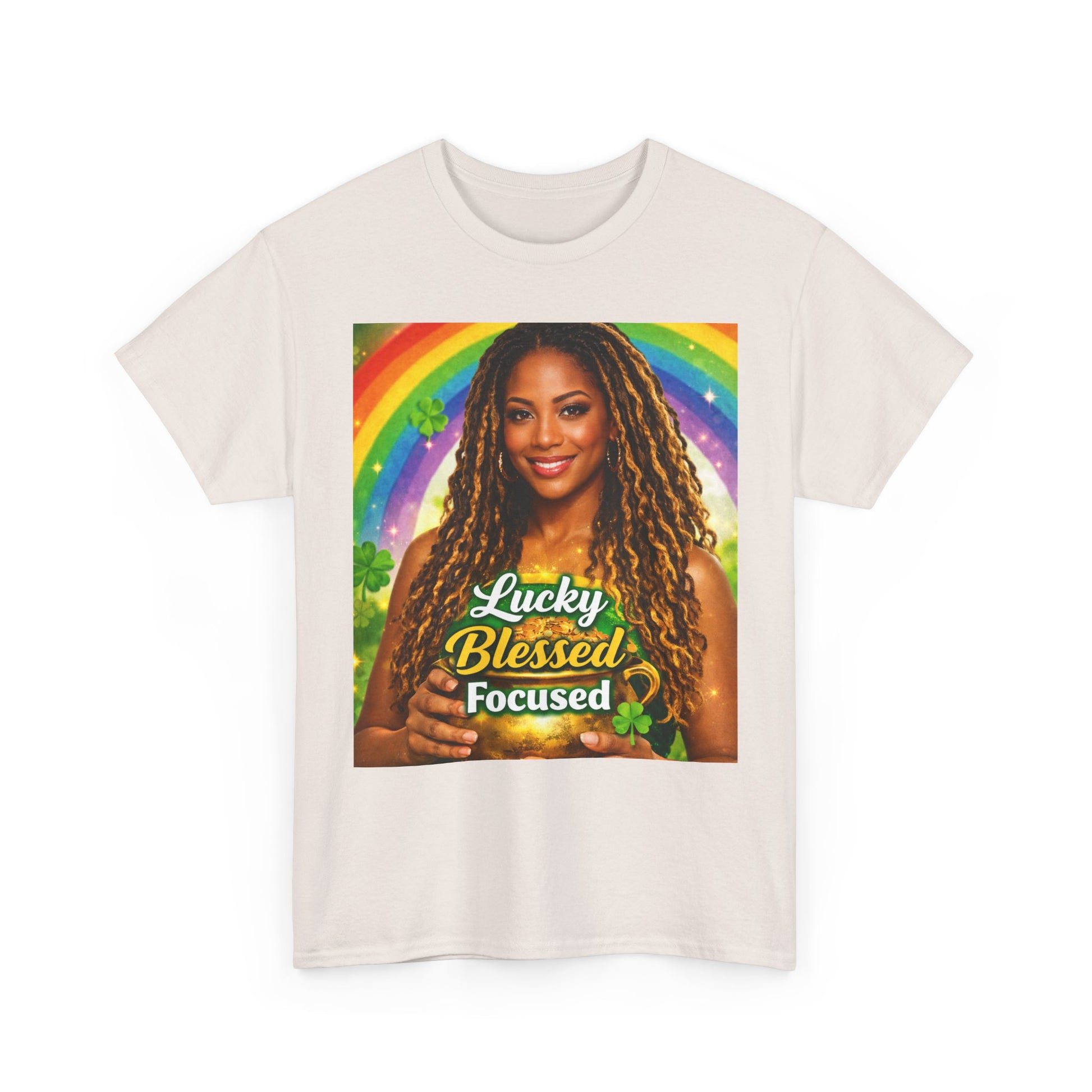 A soft, breathable cotton tee that brings bright, uplifting energy to everyday wear. The front features a colorful, high-resolution print with a cheerful rainbow backdrop, lush green accents, and bold script reading “Lucky Blessed Focused.” Lightweight but sturdy, the shirt drapes comfortably in a classic fit and keeps its shape with a ribbed collar and shoulder tape. Wear it on sunny days, to community gatherings, or when you want a little reminder to stay grounded and grateful. The vivid print pops on the clean white canvas, making the design a confident, wearable statement that pairs easily with jeans, joggers, or layered under a jacket.