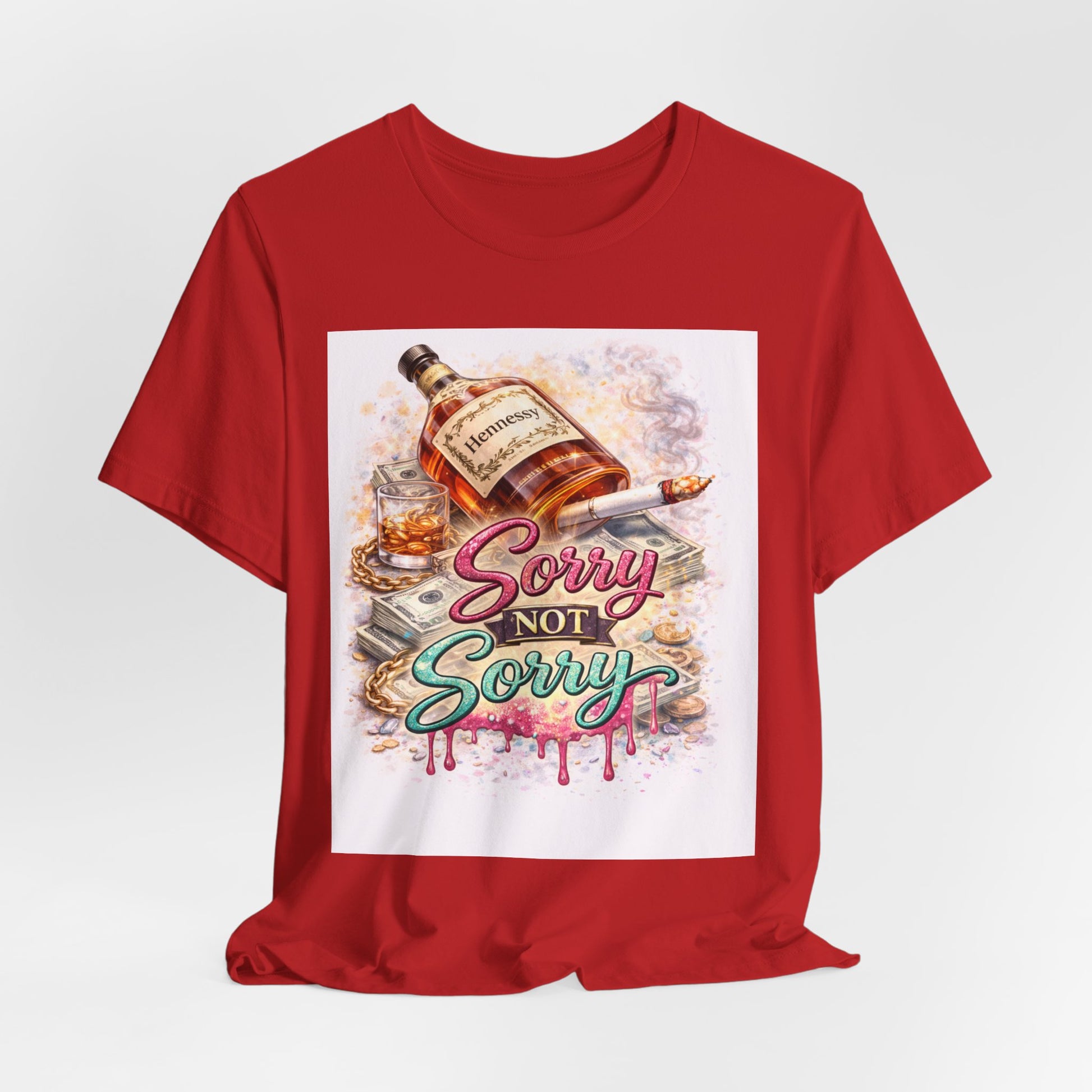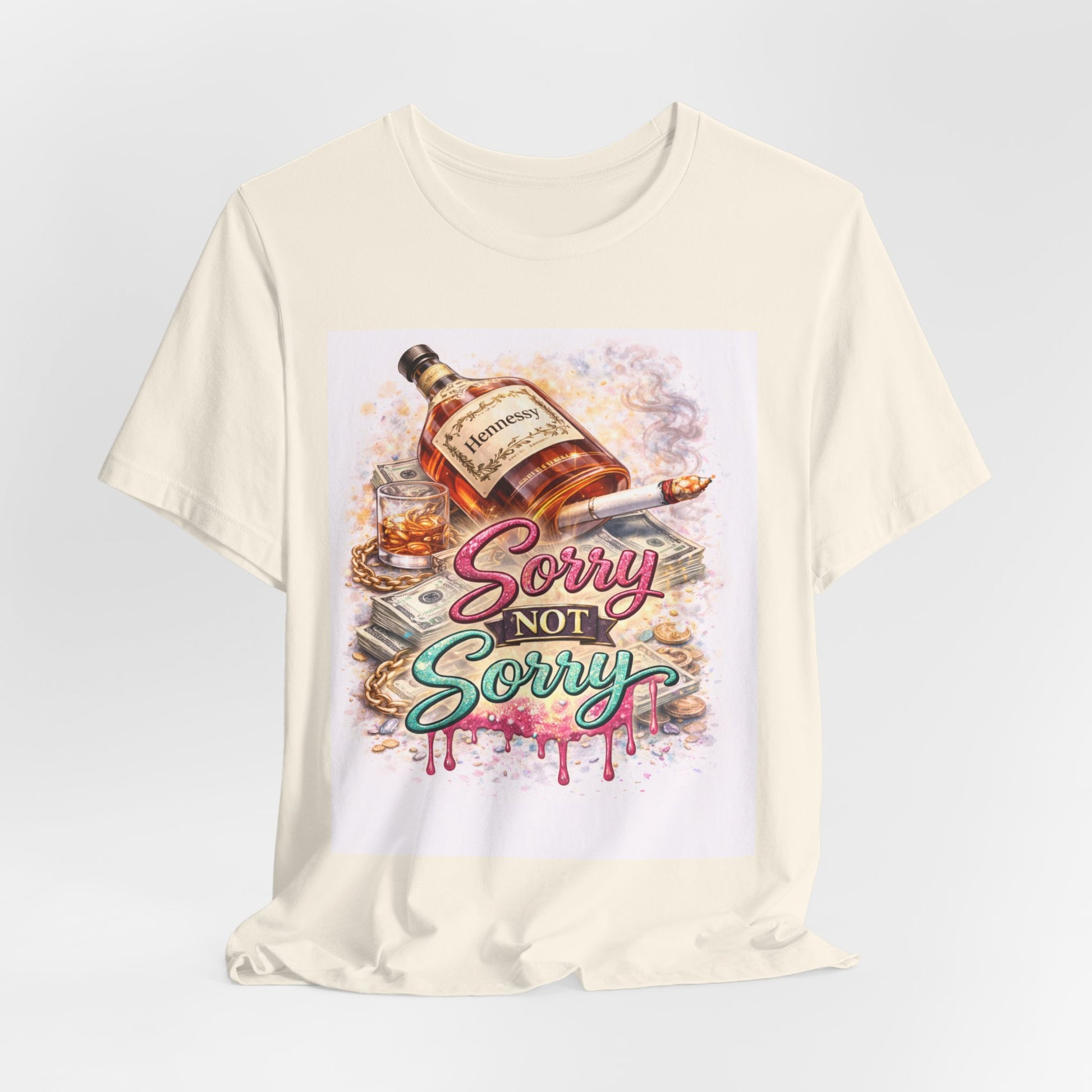 A soft, breathable tee that wears like a comfortable go-to and carries a bold, playful attitude. The artwork — a spilling bottle, money and a dripping “Sorry Not Sorry” script — reads like a wink and a dare. Wear it when you want to lean into a night-out mood, a cheeky statement at a weekend hang, or a relaxed look that still says you own the vibe. The fabric is lightweight and moves with you, the crew neck stays crisp, and the side seams keep the silhouette tidy wash after wash. Built with thoughtful construction and a tear-away label for fuss-free comfort, this shirt feels like something you reach for when you want to be casual but noticed.