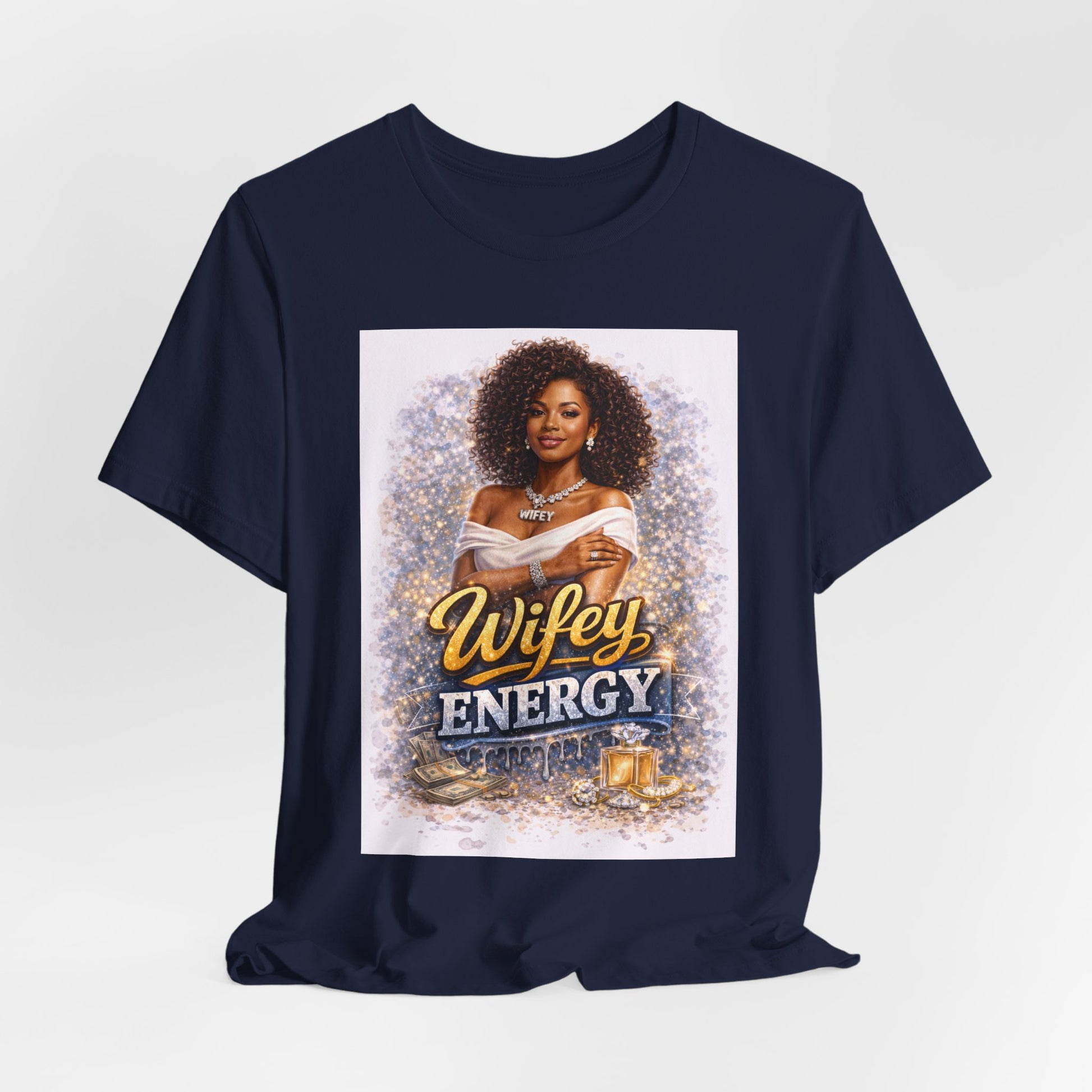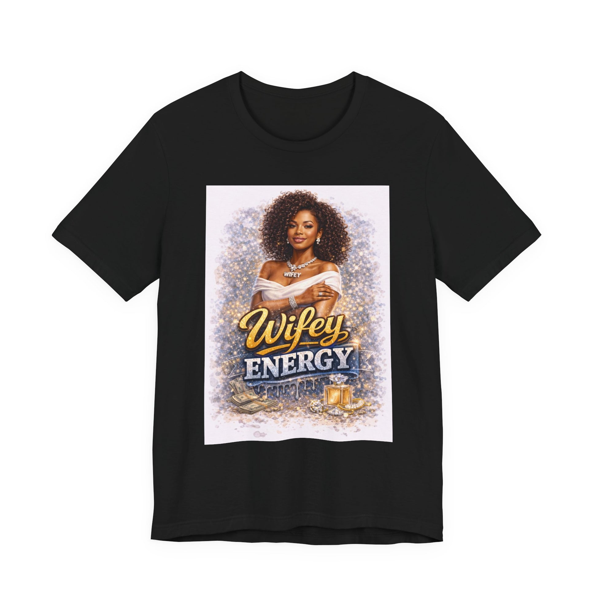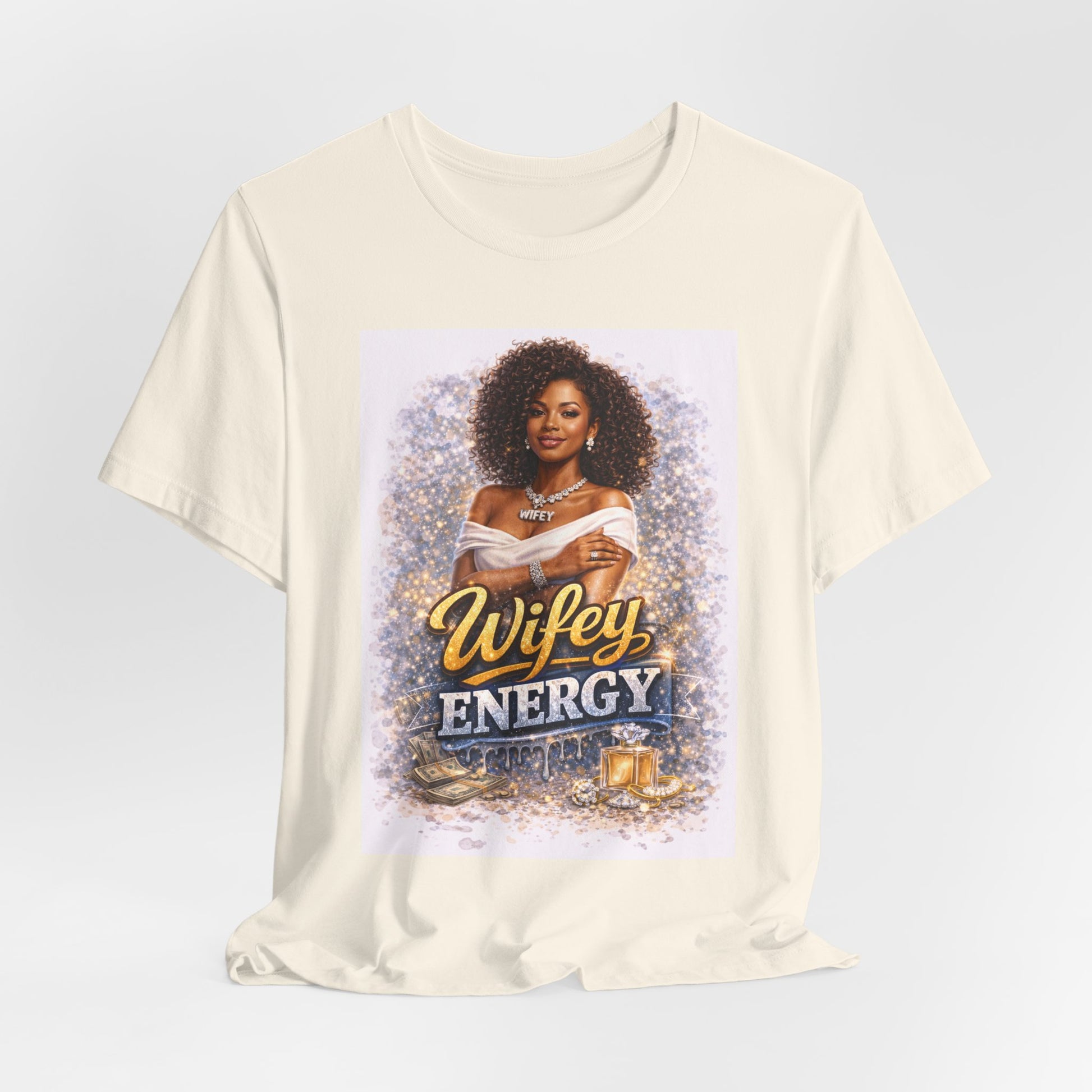 This lightweight jersey tee carries a confident, celebratory vibe — a warm portrait framed by soft glittering accents and the bold phrase “Wifey Energy.” It feels like stepping into an evening where laughter, self-worth, and elegance take center stage. Wear it with jeans and heels for date night, or layered under a blazer for a brunch where you want to look put-together but relaxed. The fabric breathes and moves with you, while the crew neckline and retail fit keep the silhouette neat and effortless. It’s for women who want clothing that speaks to pride, partnership, and polished casual style.